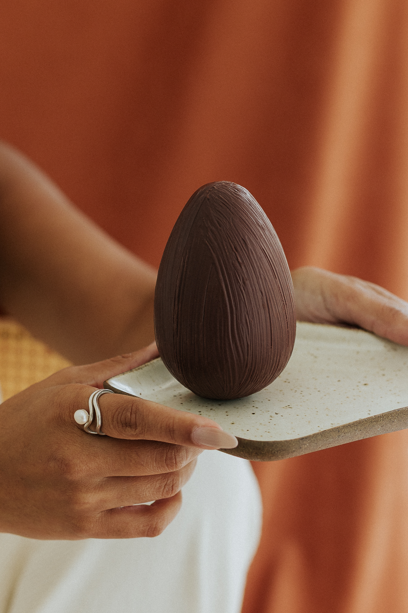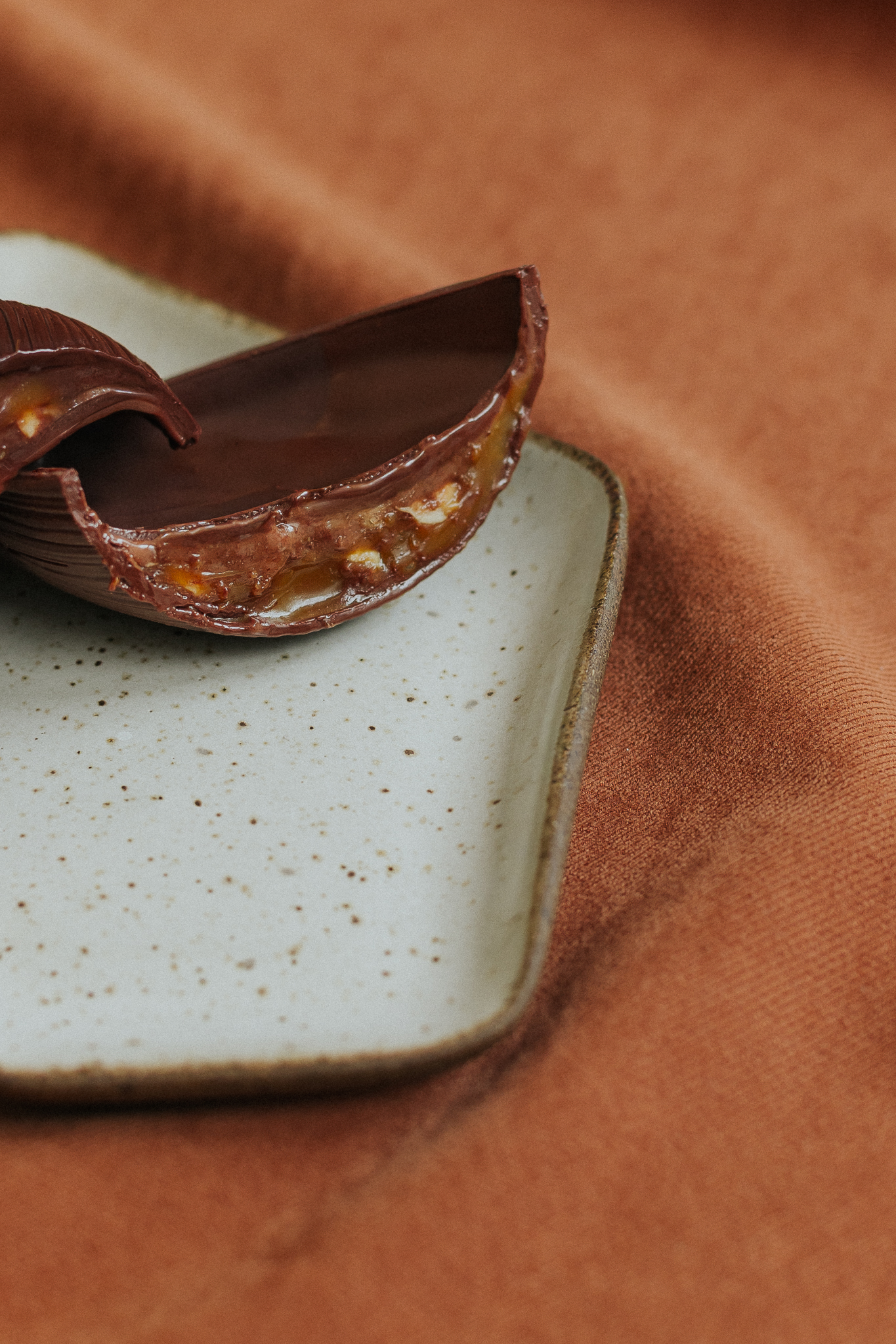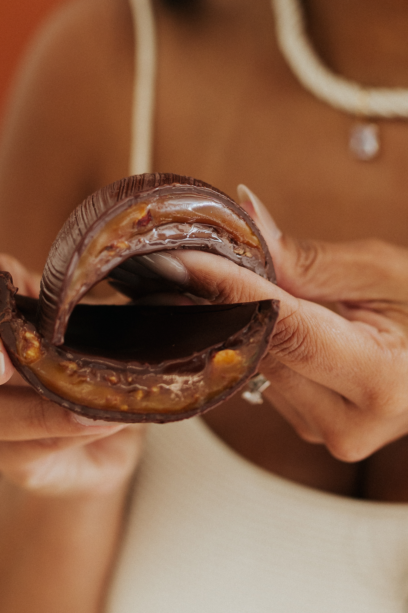 Chocolate 55% dark milk recheado com caramelo puxa com pedaços de avelã e gianduja (mistura cremosa de pasta de avelã artesanal com nosso chocolate ao leite).