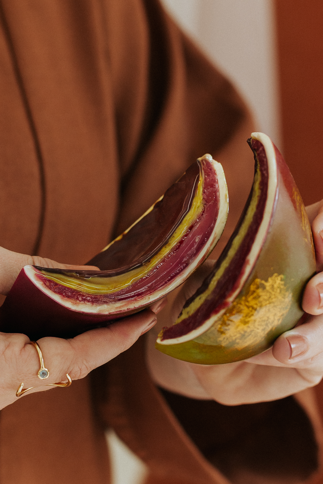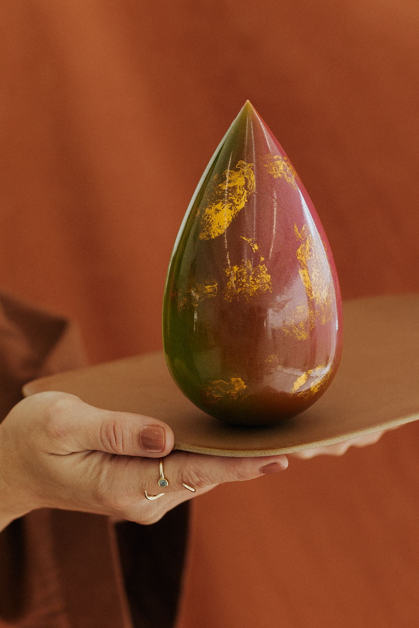 Ovo pintado a mão feito com chocolate branco recheado com caramelo de framboesa e duja de pistache (mistura cremosa de pasta de pistache artesanal e chocolate branco). Embalado em caixa personalizada exclusiva.